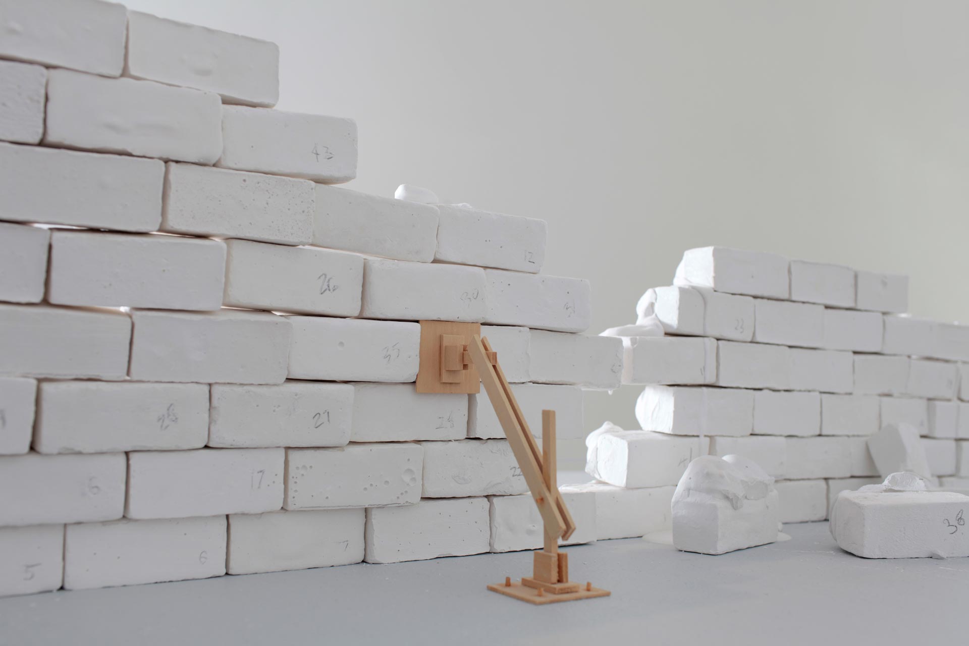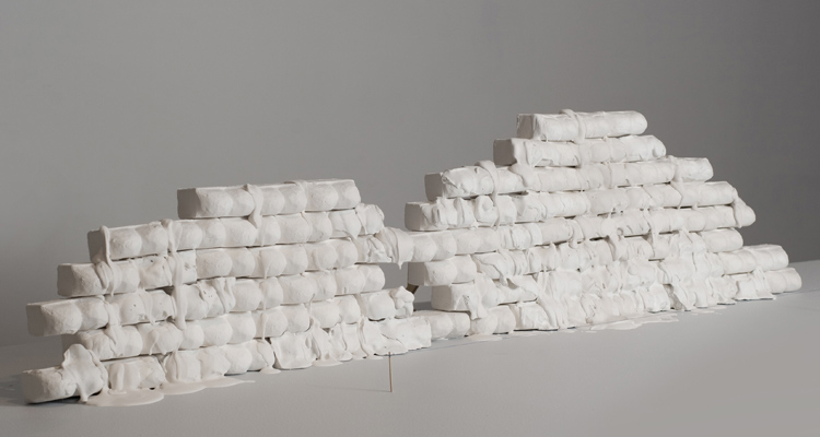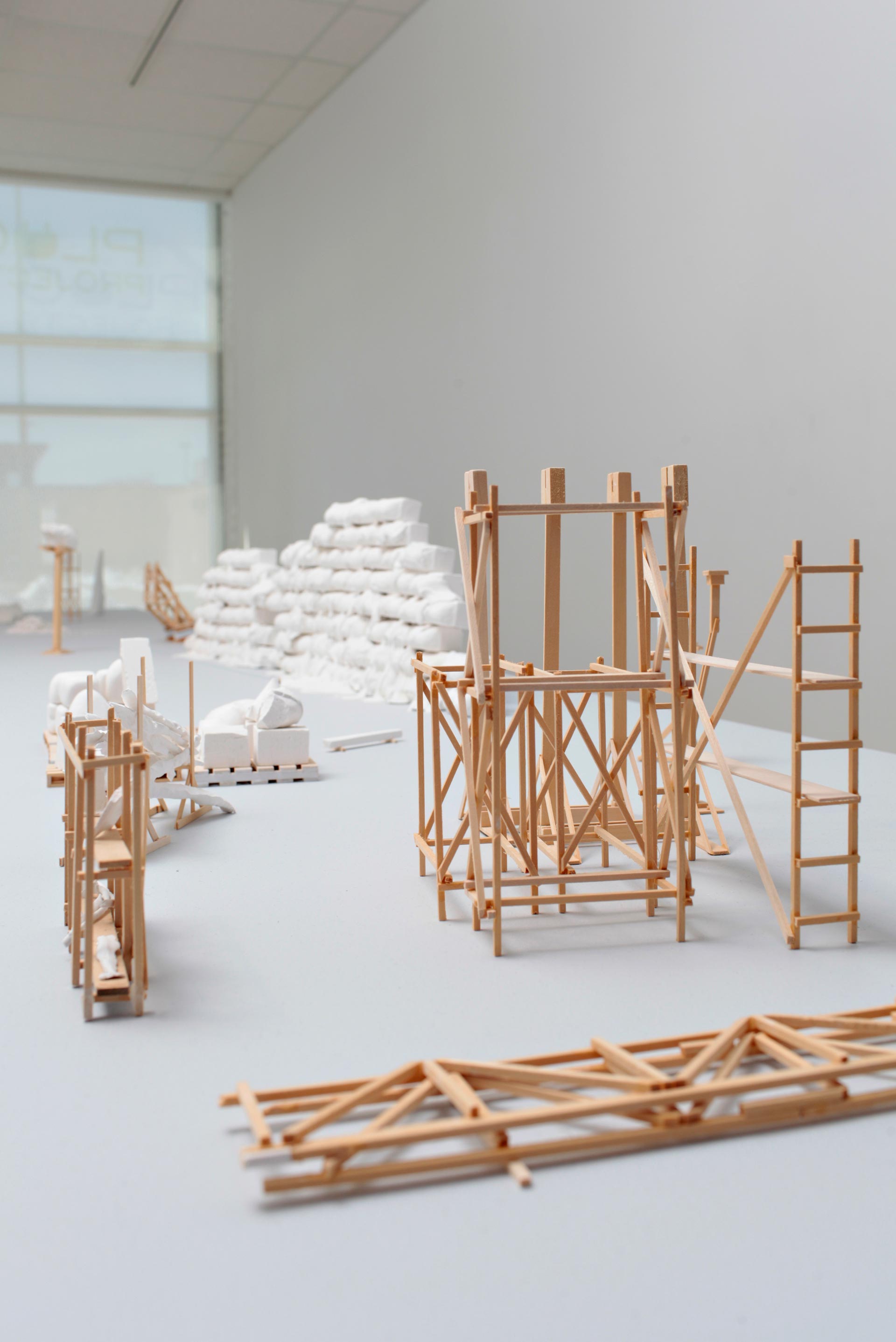 This exhibition offers a look into the intimate processes Downen employs in the studio to develop ideas and plan large scale installations. The art invites viewers to survey Downen’s work from a new and unexpected perspective. The project space features a long table and cabinet of drawers displaying models crafted from plaster, basswood, paper and gold leaf. The small scale of these sculptures explores a reversal of the experience that viewers generally have with Downen’s monumental installations. The inverted scale and assembly of the maquettes as a singular tablescape/cityscape result in a reconsideration of the forms in relationship to each other, the body and to Downen’s art making practice overall.