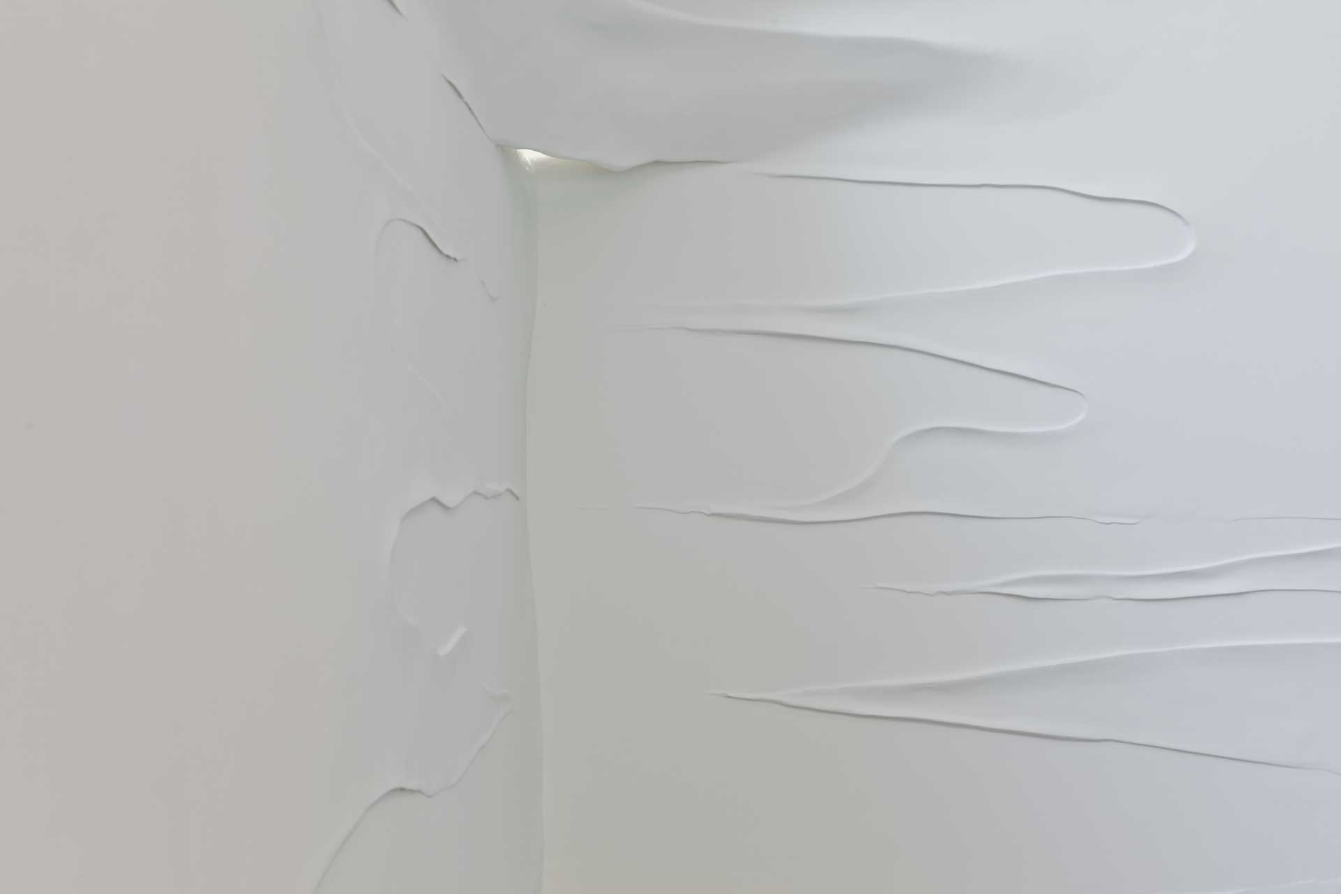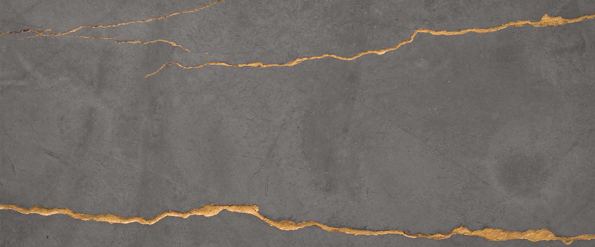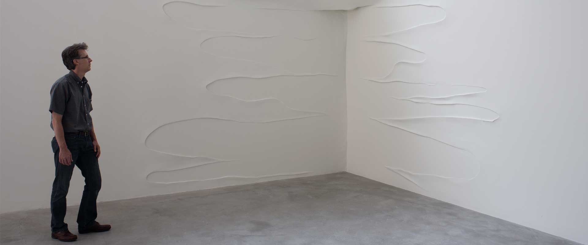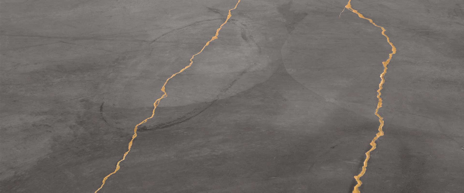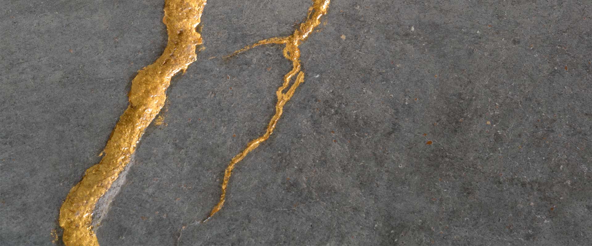 Curated by Brad Cloepfil and Dominic Molon to celebrate CAM’s 10th Anniversary, the installation is part of the exhibition Place is the Space. Composed of two parts, Beauty Mark suggests our complex relationship to architectural structures and memory. The first part re-creates the de-installation of Downen’s work The Posture of Place, produced for CAM’s first Great Rivers Biennial in 2004. The removal of the art left a pattern of staggered, elliptical scars in the wall that are deliberately reconstructed here, implying how the physical remnants of every artist’s work presented at CAM has become a hidden part of the building’s history. For the new installation’s second component, Downen uses gold leaf (along with her father Wayland Downen and brother Greg Downen, master guilders) to fill in the long crack in the main gallery’s concrete floor. Downen’s work elevates a blemish – an inevitable result of the ambitious single pour of concrete – in the otherwise seamless surface of the museum floor.