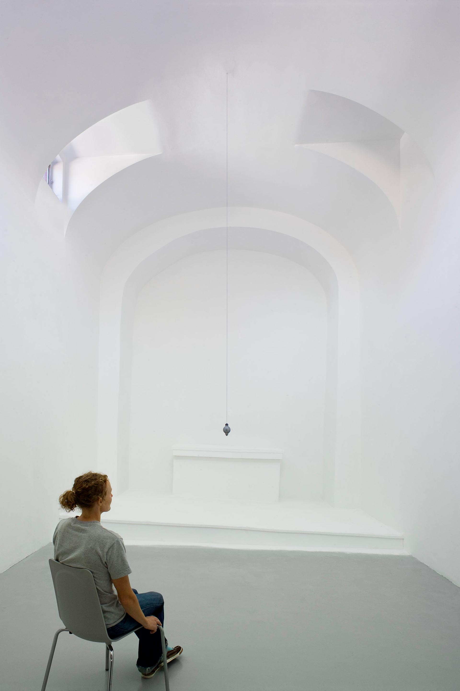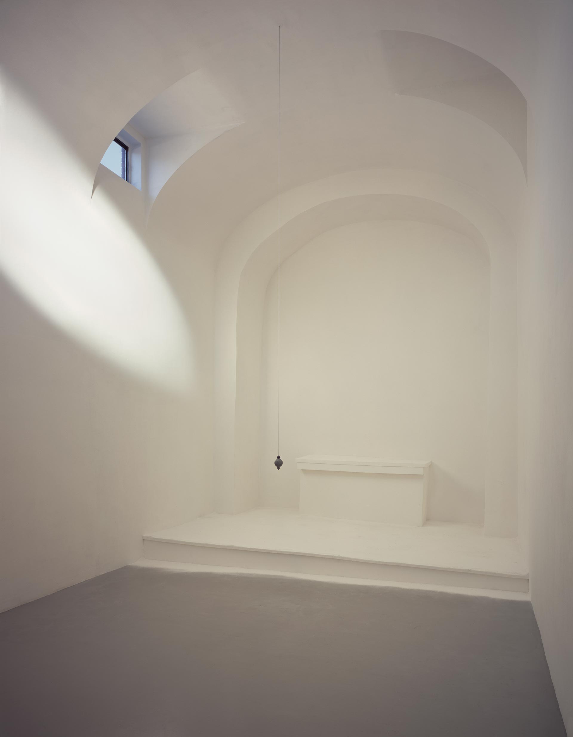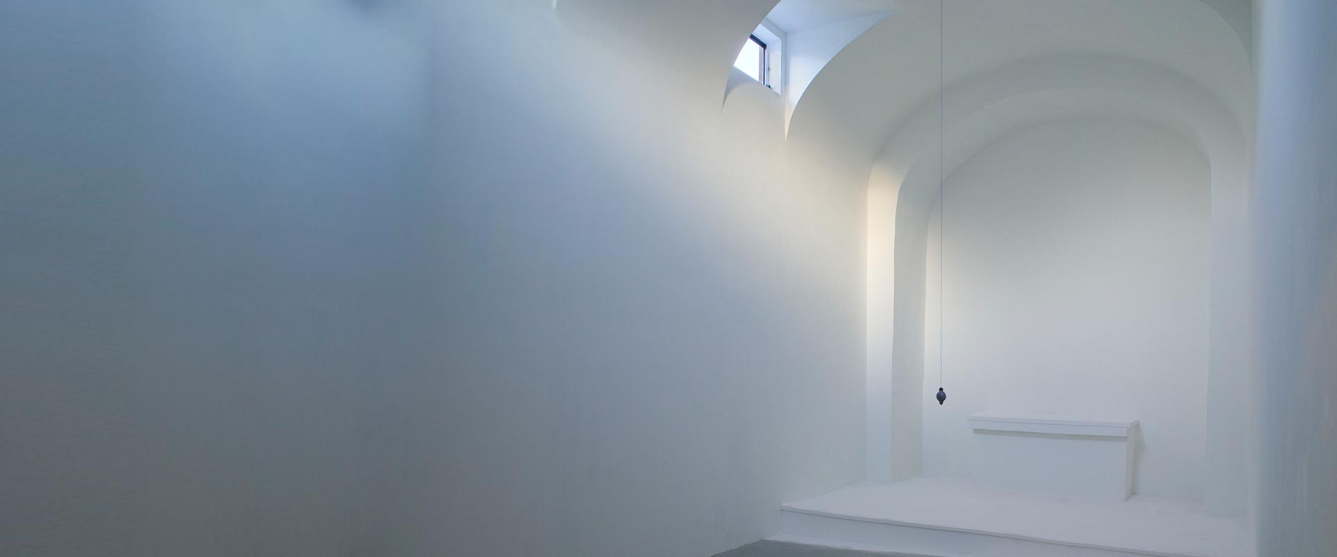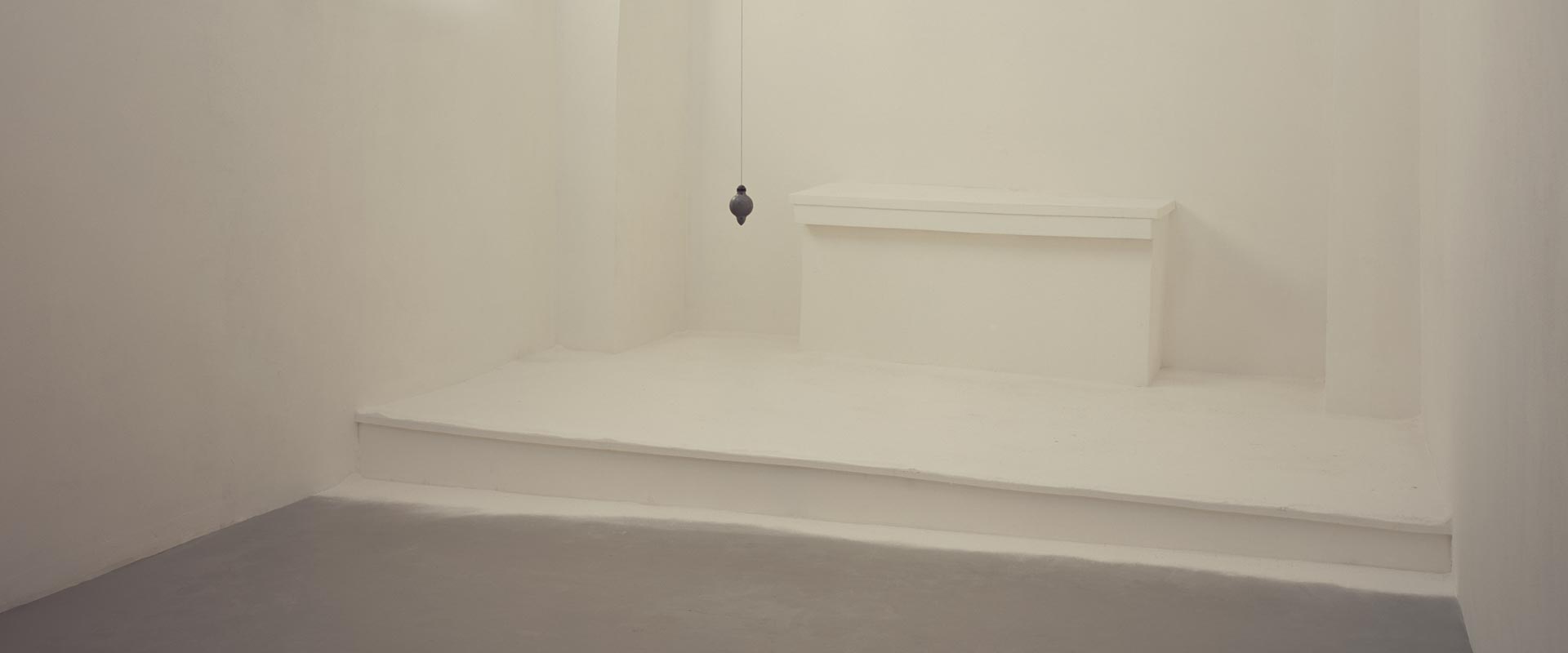 The human need for quietness and stillness inspired this site-specific installation created in a former chapel. I transformed the architecture by misaligning the chapel’s symmetry, edges, and wall angles. Natural light caused a diffuse glow and the air was mildly scented with pure frankincense and myrrh. The resulting sensation of the tilt of the room was subtle, yet anchored by a single plumb line hung at the height of an adult viewer’s heart. One viewer at a time was admitted to the installation and invited to stay as long as desired. Sensorial perception and awareness were heightened in viewers who reported an experience that was both meditative and disorienting. With a clear spiritual context, the installation offered a place to contemplate what we perceive as true in relation to physical reality.