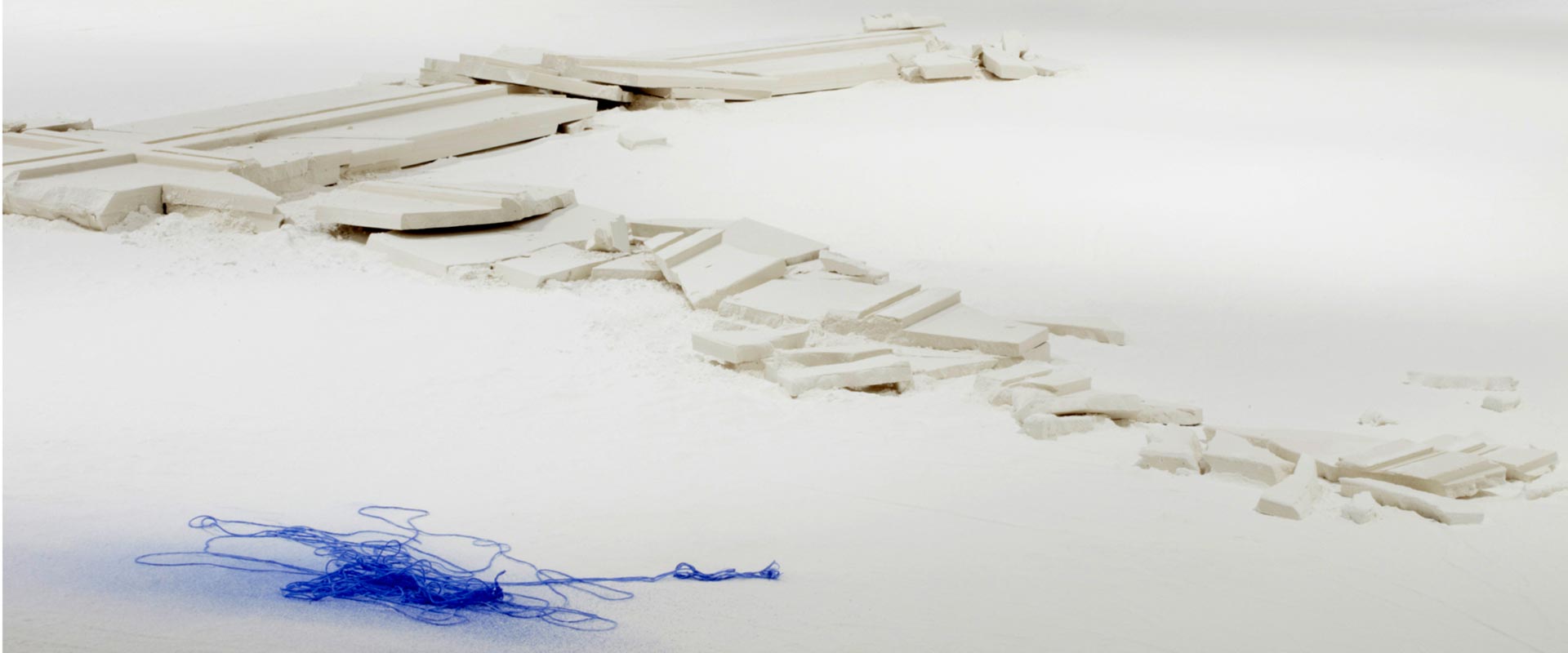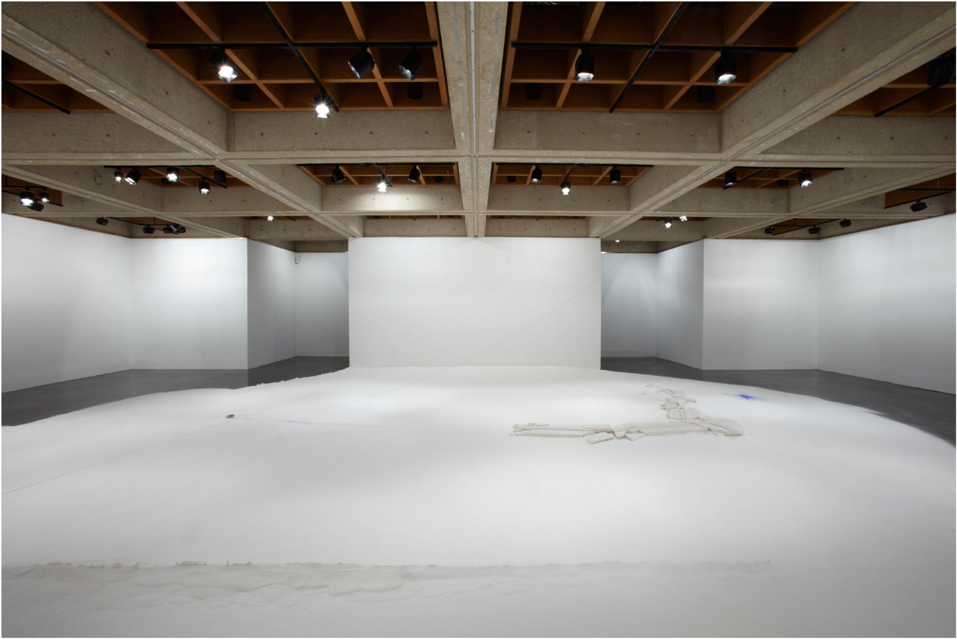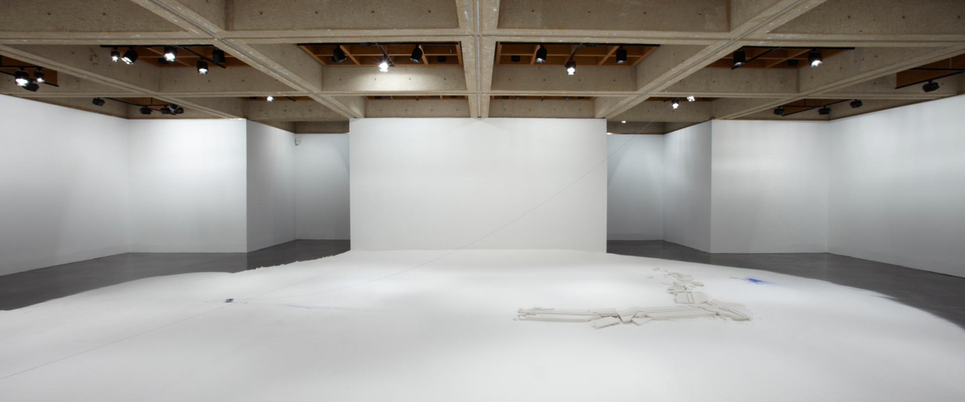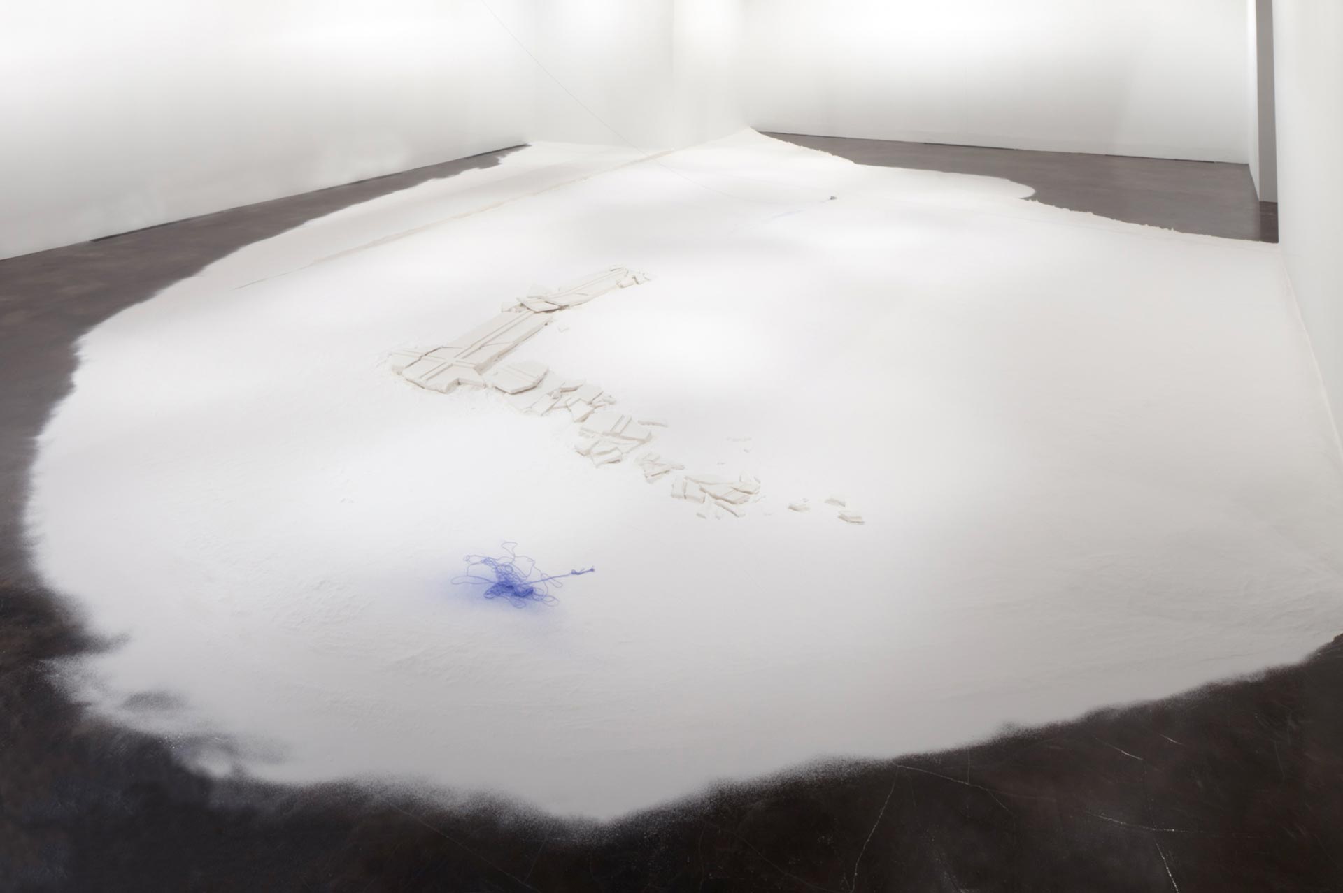 “A fundamental starting point for Downen is her view of architecture as a body with a life of its own. Making connections between the constructed environment and human forms, her work reveals unspoken notions about the self as a physical and cultural body. Downen asserts that both bodies and buildings possess strength and power, and both are at the same time vulnerable, reacting to the natural forces of decay and gravity. Her primary material, plaster of Paris or powdered gypsum— used in casts for mending broken bones and for making sculptures—refers to building, covering, and repairing. Each installation evolves from the personality of the space and the concepts it inspires. In this exhibition Downen’s language resolves upon edges and debris as well as the phenomena of void and intersection.”