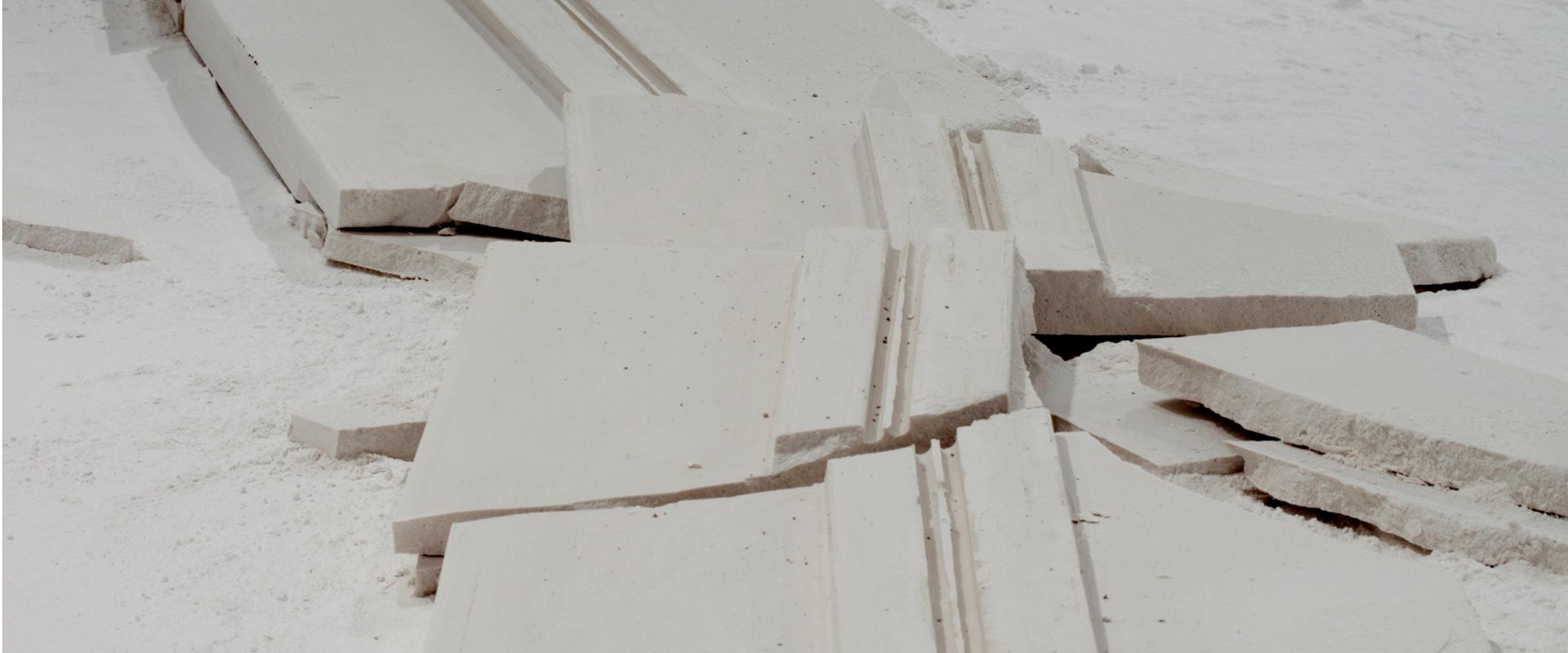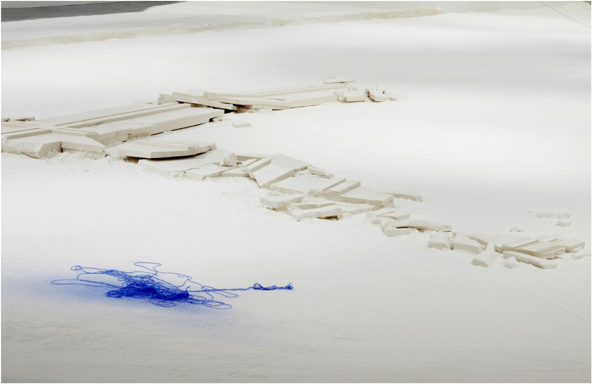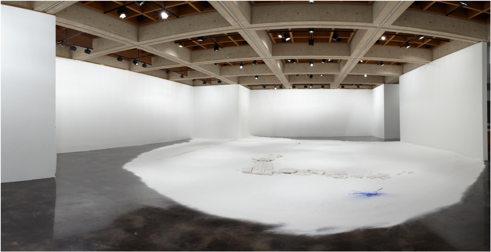 “A fundamental starting point for Downen is her view of architecture as a body with a life of its own. Making connections between the constructed environment and human forms, her work reveals unspoken notions about the self as a physical and cultural body. Downen asserts that both bodies and buildings possess strength and power, and both are at the same time vulnerable, reacting to the natural forces of decay and gravity. Her primary material, plaster of Paris or powdered gypsum— used in casts for mending broken bones and for making sculptures—refers to building, covering, and repairing. Each installation evolves from the personality of the space and the concepts it inspires. In this exhibition Downen’s language resolves upon edges and debris as well as the phenomena of void and intersection.”