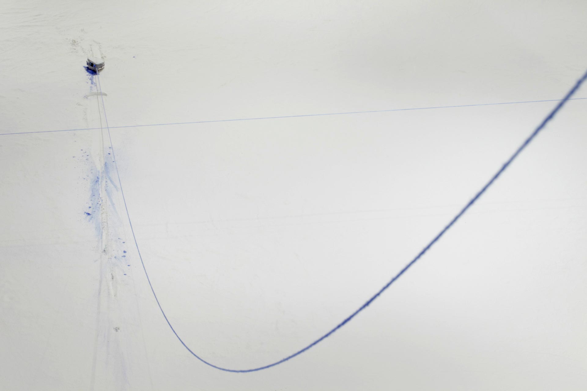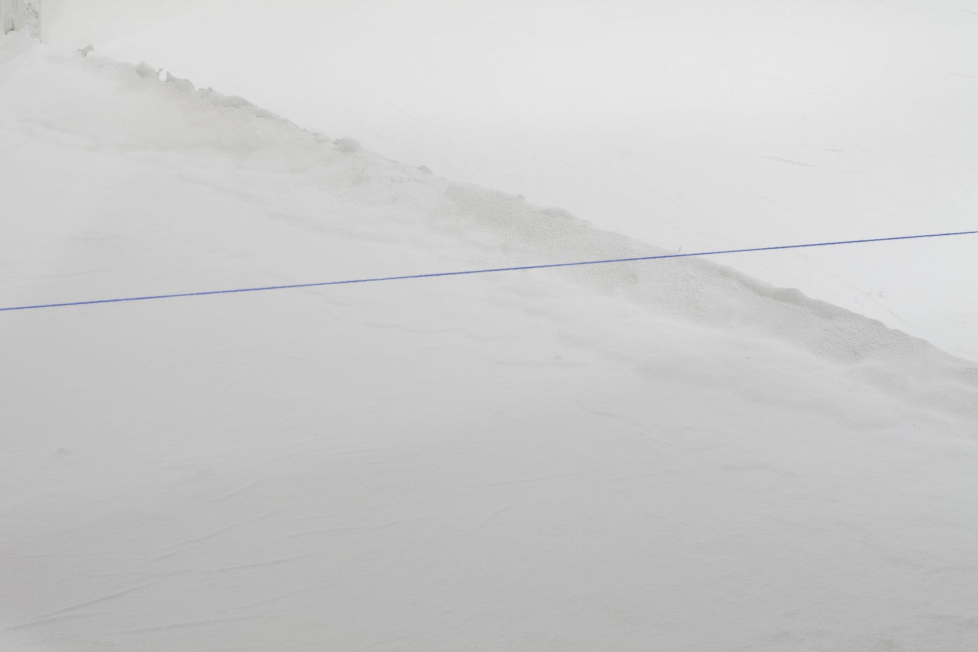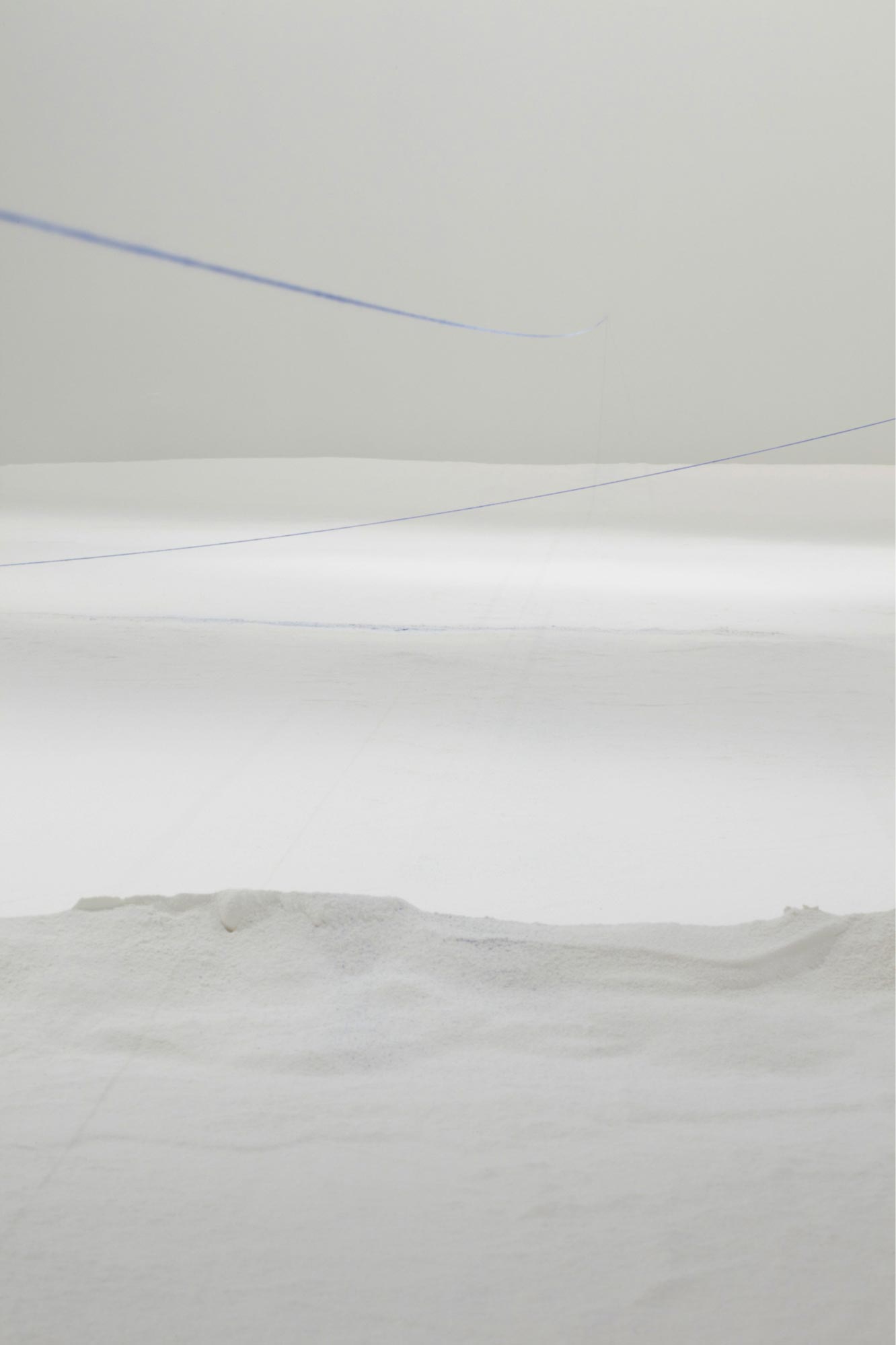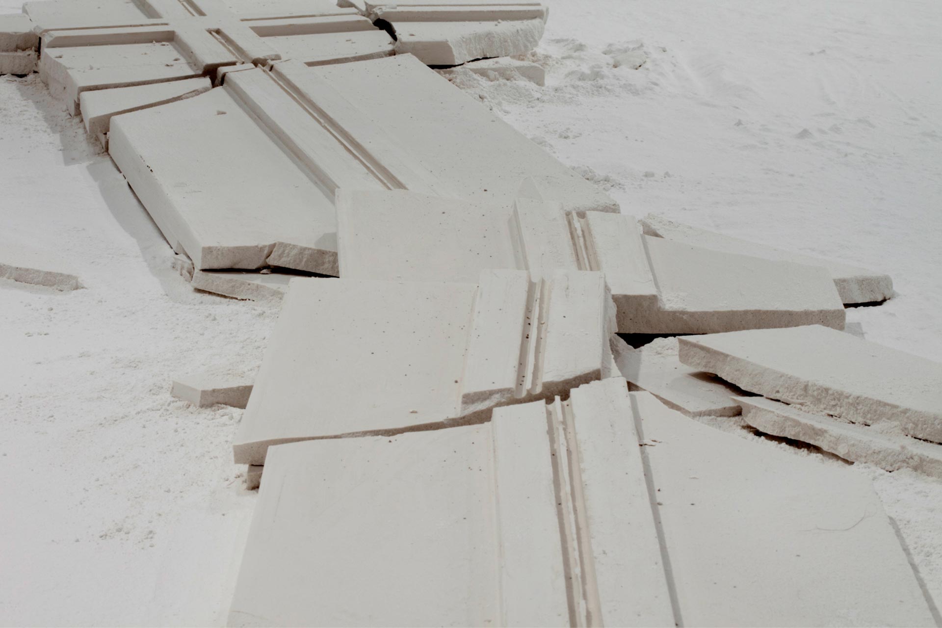 “A fundamental starting point for Downen is her view of architecture as a body with a life of its own. Making connections between the constructed environment and human forms, her work reveals unspoken notions about the self as a physical and cultural body. Downen asserts that both bodies and buildings possess strength and power, and both are at the same time vulnerable, reacting to the natural forces of decay and gravity. Her primary material, plaster of Paris or powdered gypsum— used in casts for mending broken bones and for making sculptures—refers to building, covering, and repairing. Each installation evolves from the personality of the space and the concepts it inspires. In this exhibition Downen’s language resolves upon edges and debris as well as the phenomena of void and intersection.”