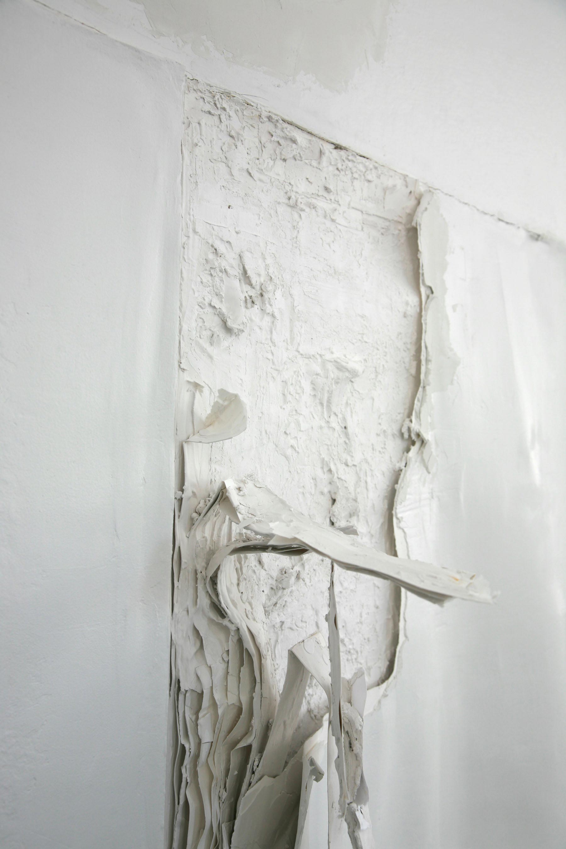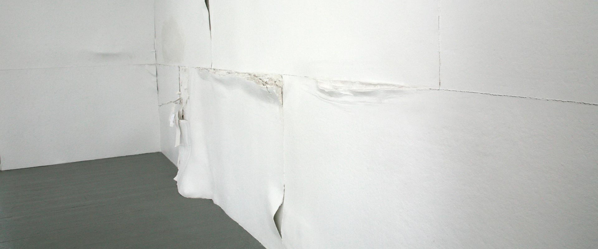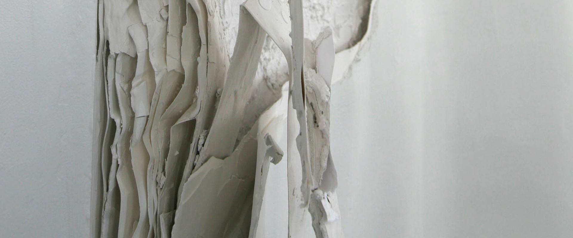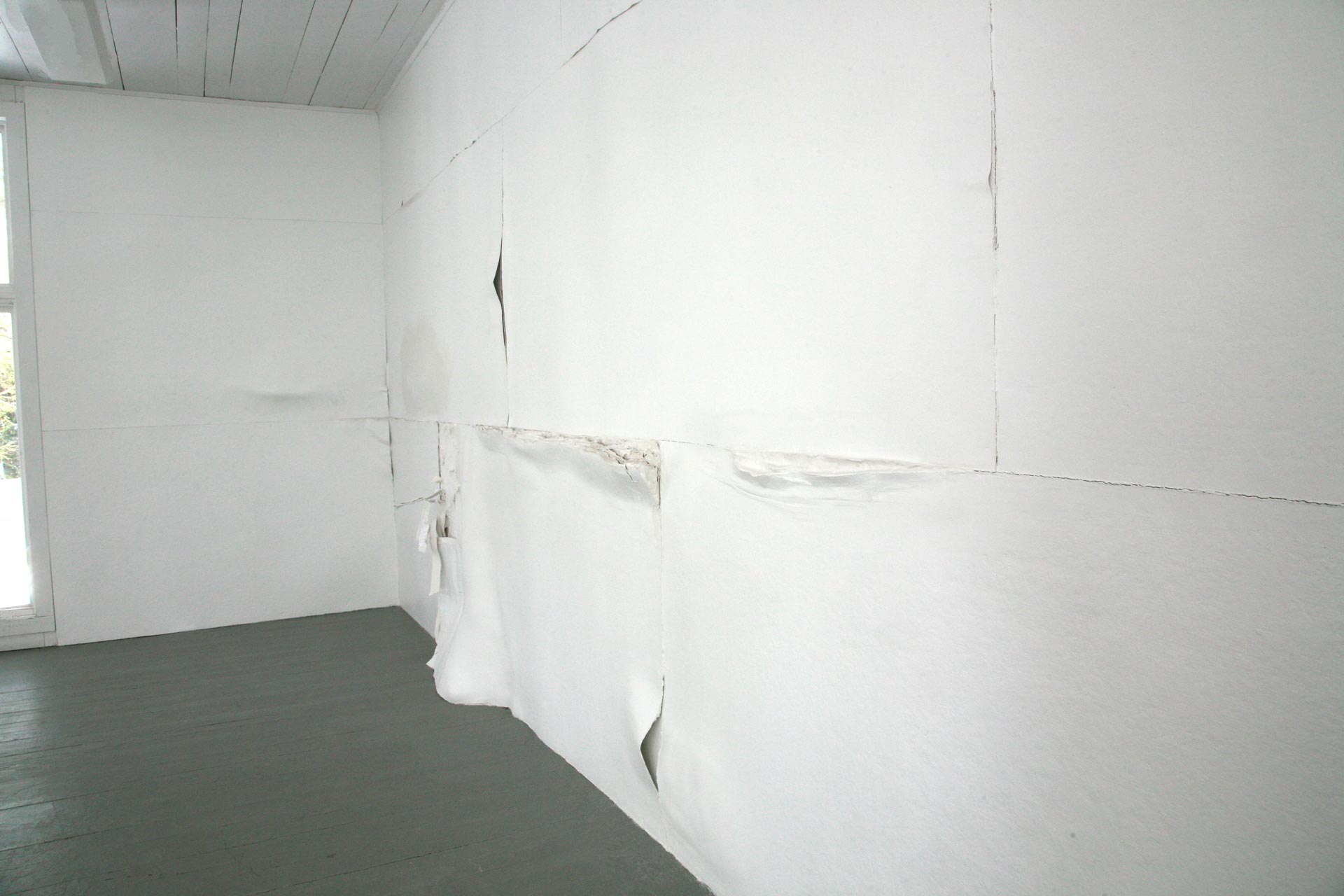 I spent time at the MacDowell Colony as a National Endowment for the Arts fellow in February of 2009. My project directly responded to the architectural environment at the colony. Within the Cheney Studio, walls made with panels of homasote had warped over time. My intervention into the architecture redefined the space as a site for reconciliation between deterioration and preservation. The seams, or “lines of joining” between the panels, became the starting point of a 24-day experiment working directly on the walls. Daily sessions involved excavating and digging into the wall, followed by sculpting areas with fresh plaster. The expansion and contraction of the wall’s surface generated a collection and arrangement of plaster fragments on the floor. This temporal installation explored the demarcation of space as a volume that came apart at the seams.