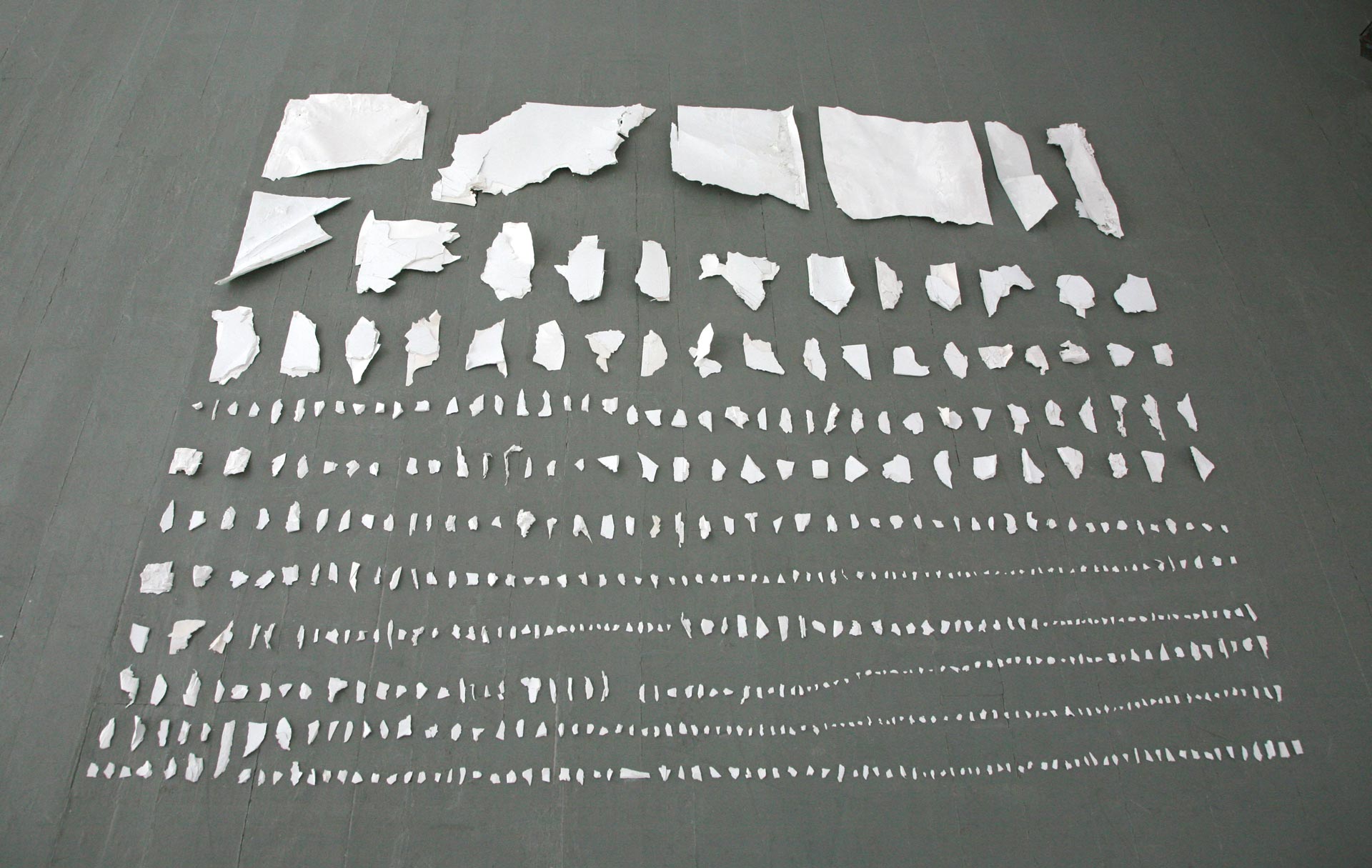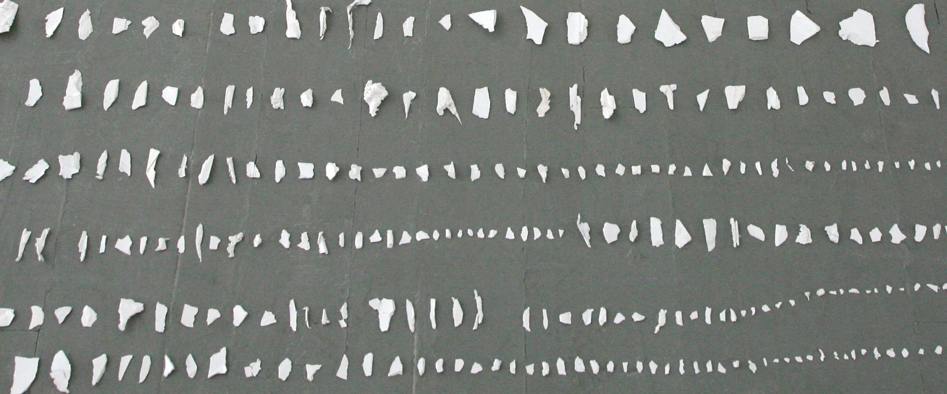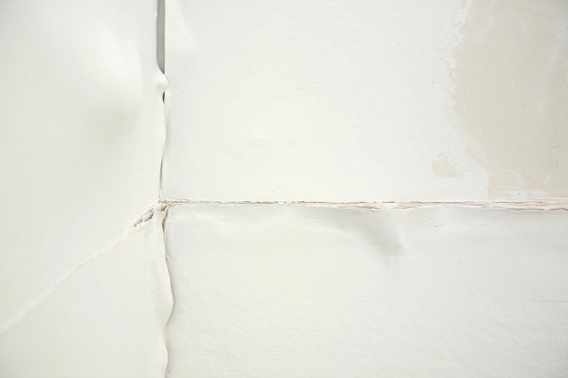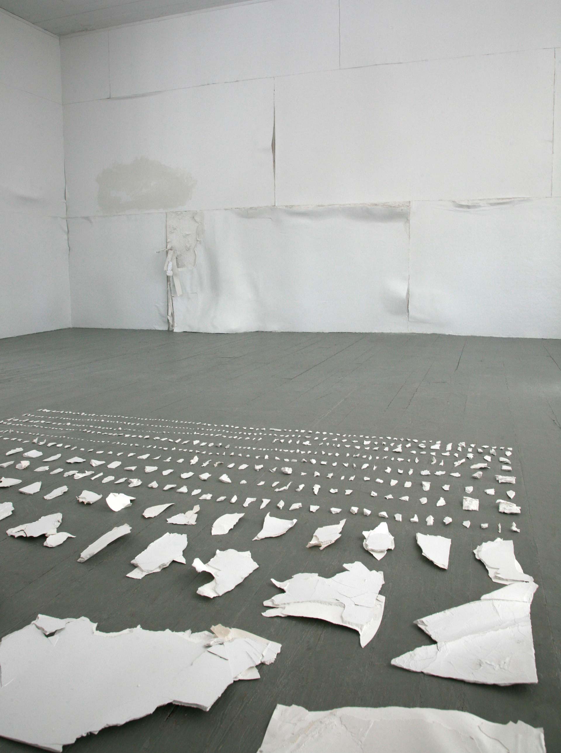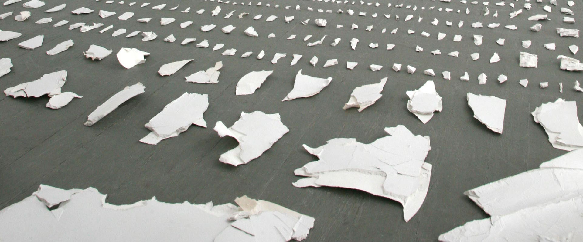 I spent time at the MacDowell Colony as a National Endowment for the Arts fellow in February of 2009. My project directly responded to the architectural environment at the colony. Within the Cheney Studio, walls made with panels of homasote had warped over time. My intervention into the architecture redefined the space as a site for reconciliation between deterioration and preservation. The seams, or “lines of joining” between the panels, became the starting point of a 24-day experiment working directly on the walls. Daily sessions involved excavating and digging into the wall, followed by sculpting areas with fresh plaster. The expansion and contraction of the wall’s surface generated a collection and arrangement of plaster fragments on the floor. This temporal installation explored the demarcation of space as a volume that came apart at the seams.
