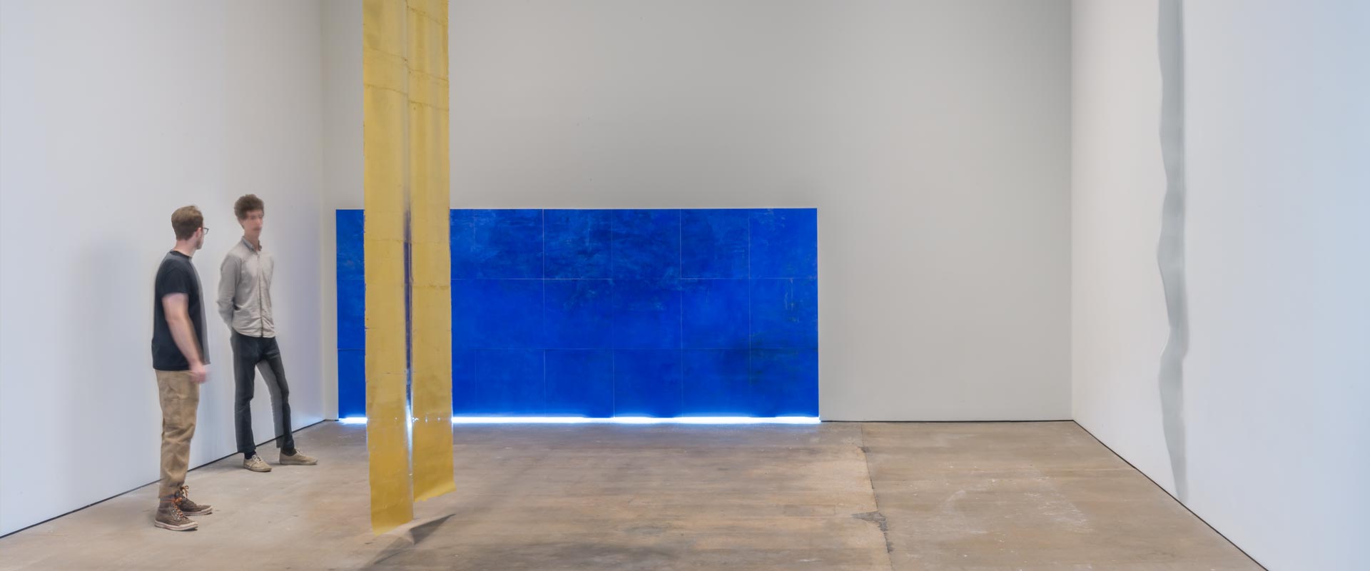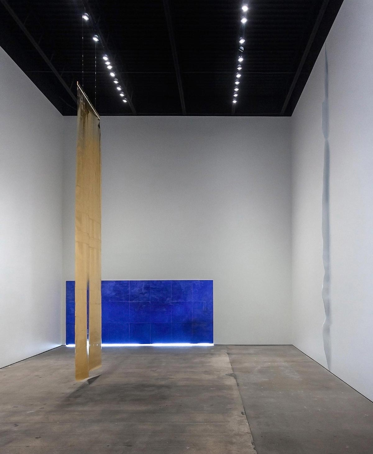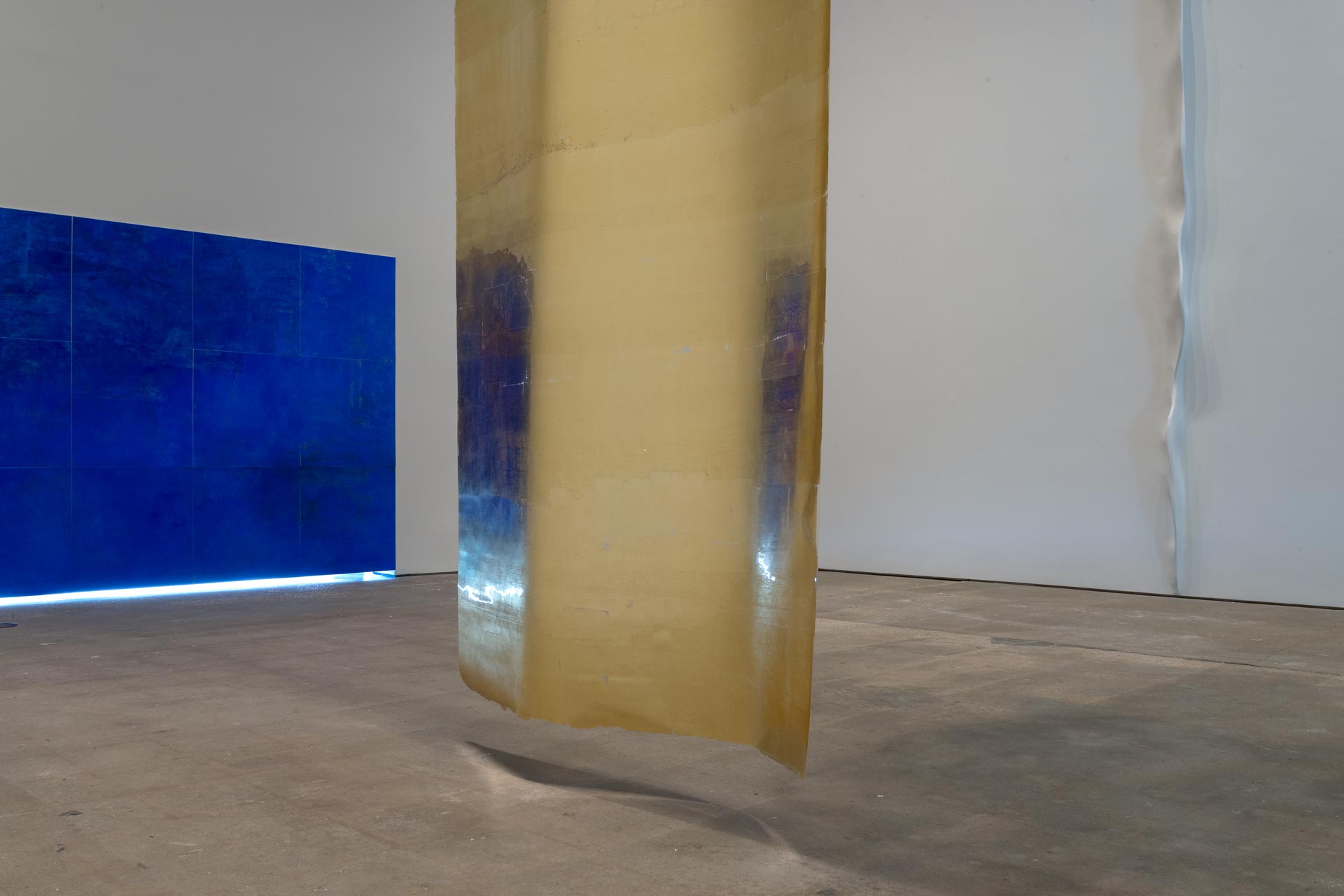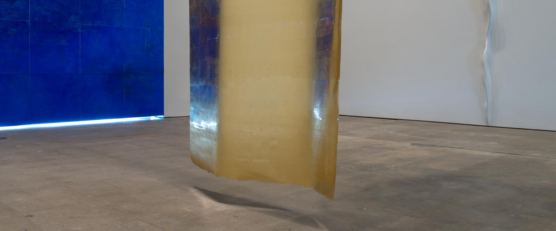 “Threshold explores a world of perception, sensation and experience activated by an installation of interconnected components…As viewers advance toward the reflective wall of gold, blurred outlines of the surrounding world are cast back as distorted shadowy forms. In passing by the crease of the golden acetate formed by oscillating air in the space, our own out-of- focus body is abruptly slowed down, and for a brief moment we pass by an impression of ourselves. This slight drag in time, a tear in our present temporal moment, makes us acutely aware of our own trajectory in the space.”