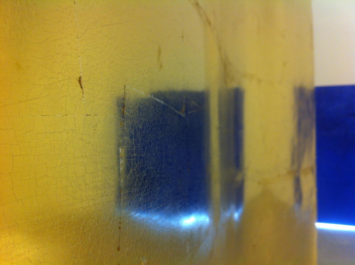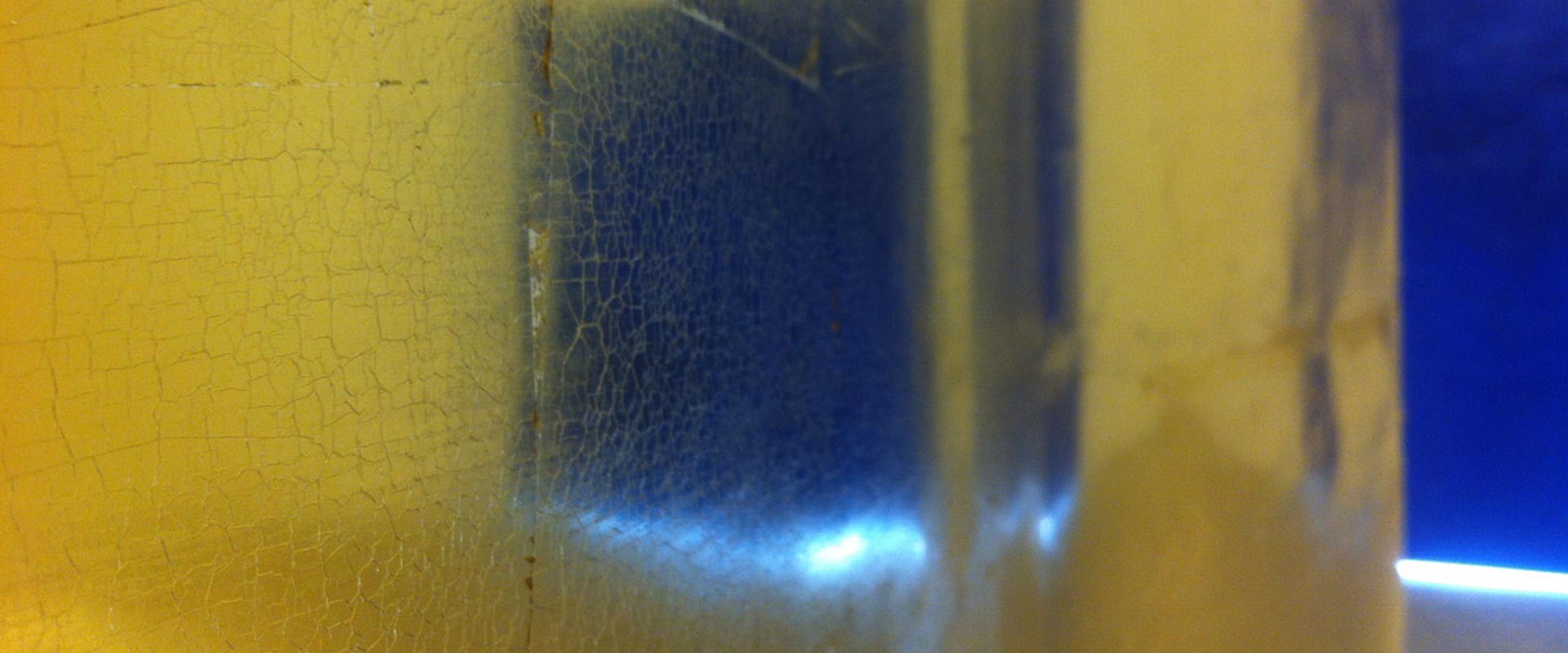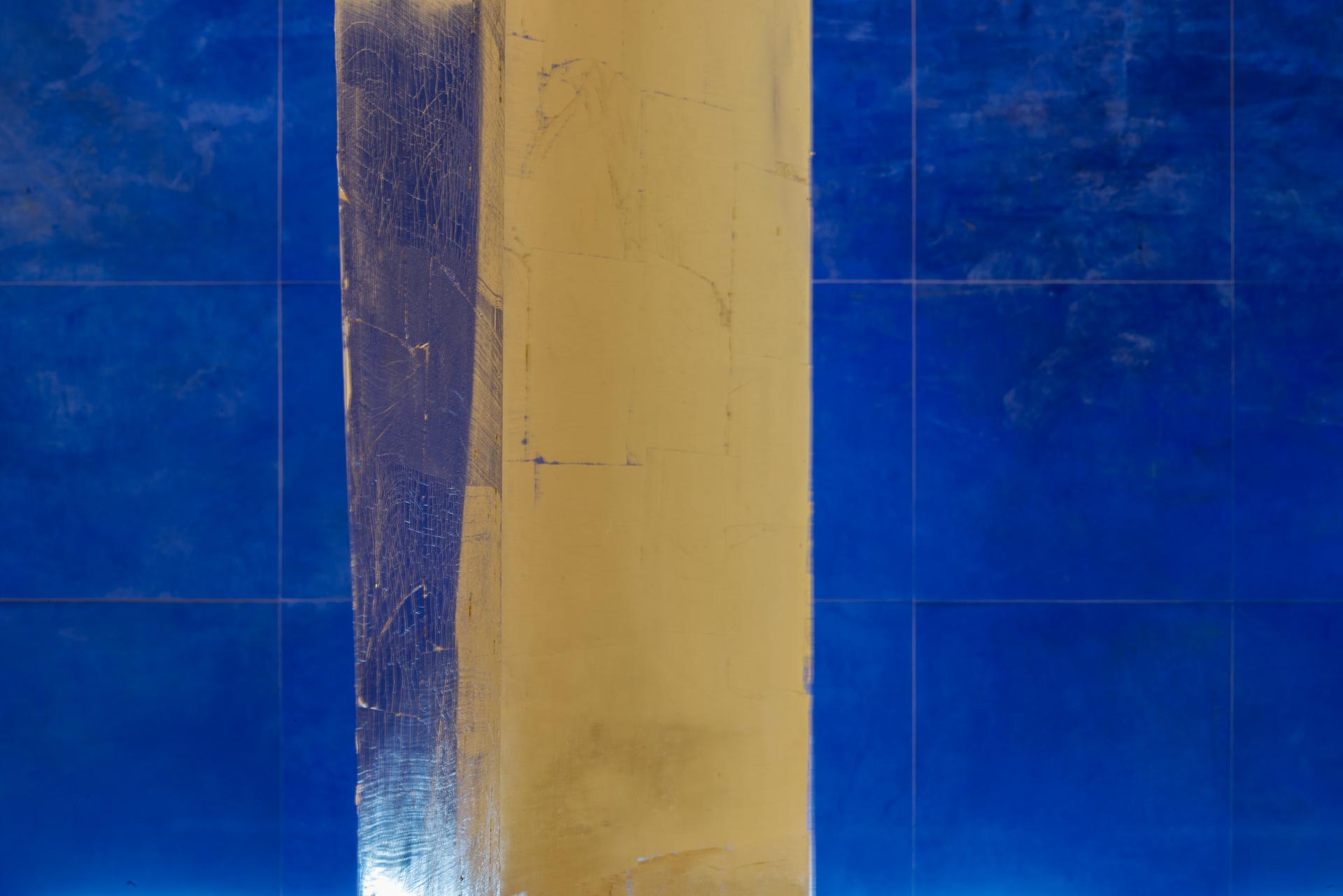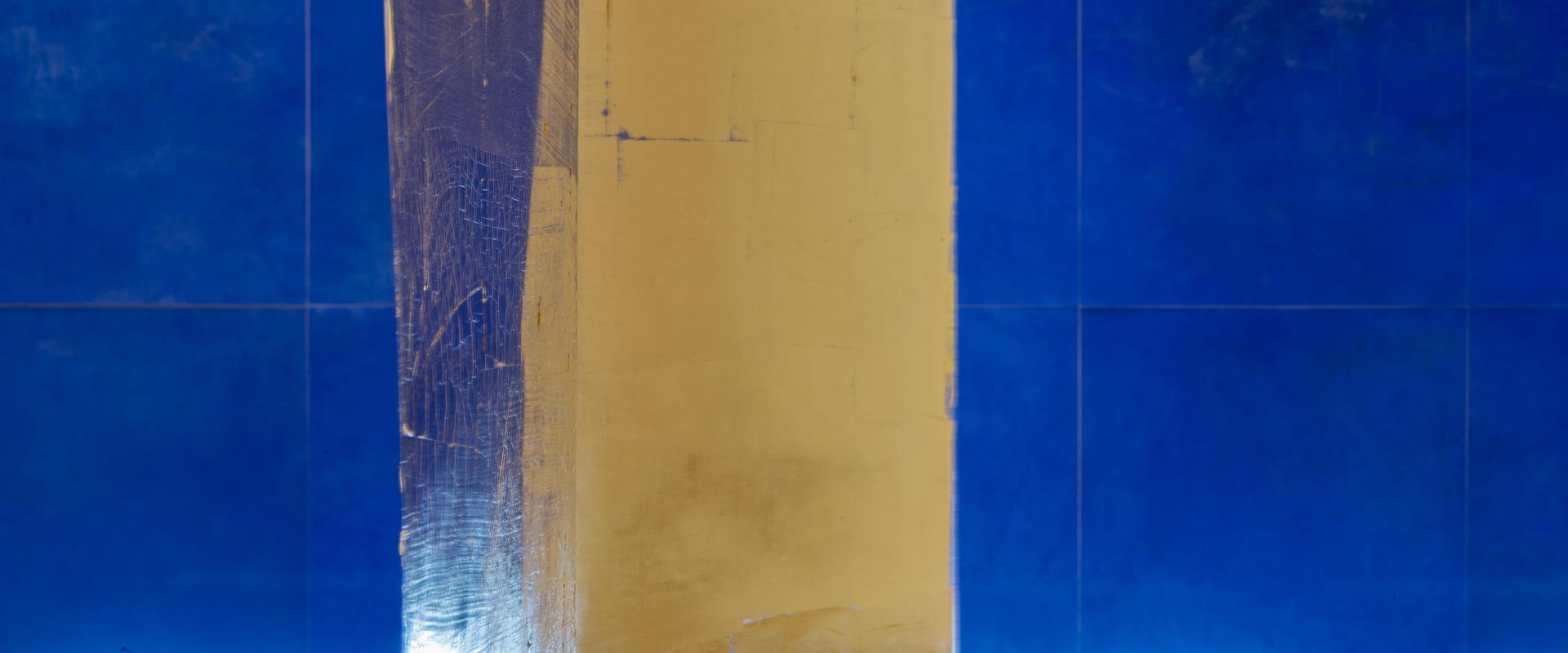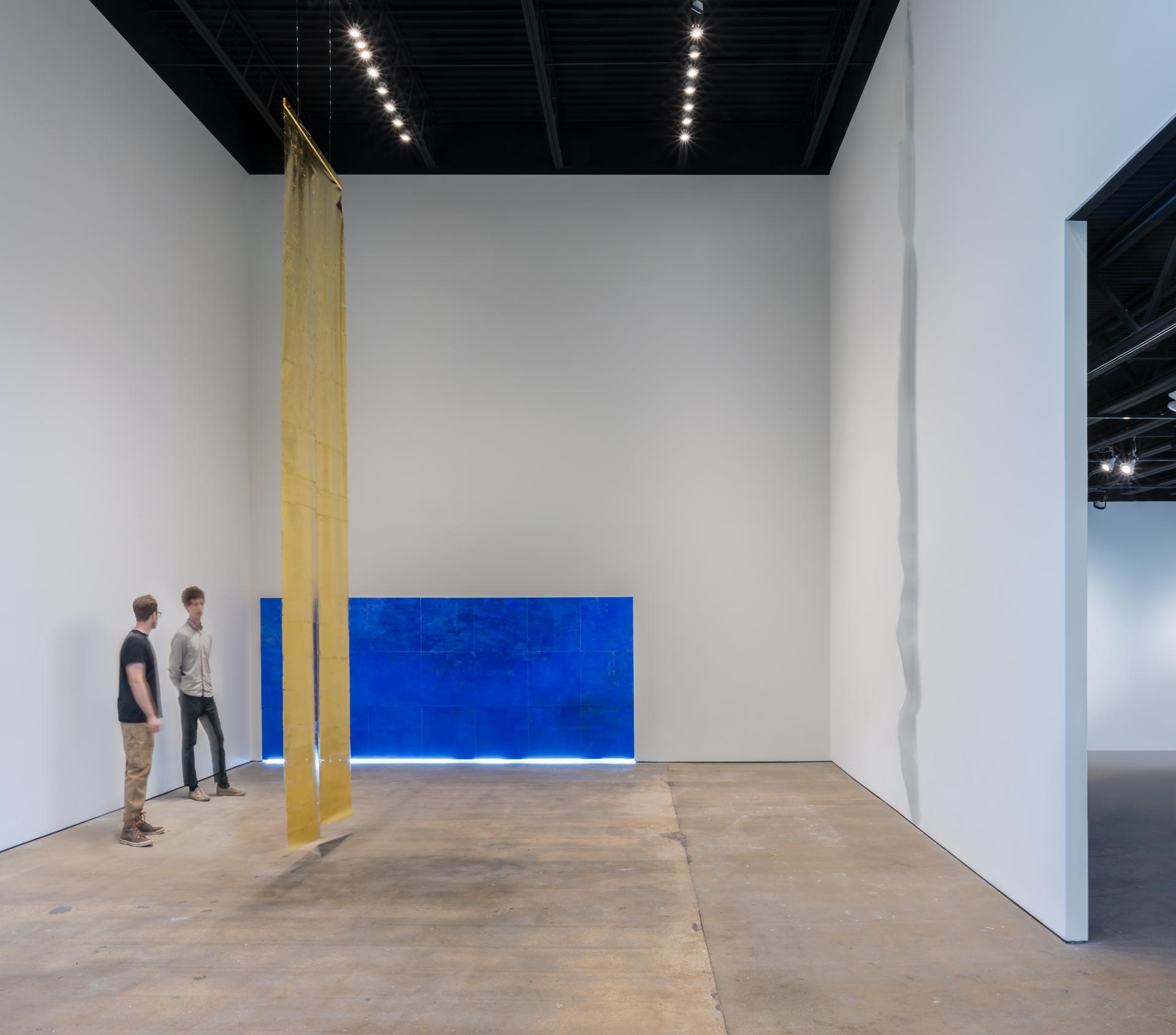 “Threshold explores a world of perception, sensation and experience activated by an installation of interconnected components…As viewers advance toward the reflective wall of gold, blurred outlines of the surrounding world are cast back as distorted shadowy forms. In passing by the crease of the golden acetate formed by oscillating air in the space, our own out-of- focus body is abruptly slowed down, and for a brief moment we pass by an impression of ourselves. This slight drag in time, a tear in our present temporal moment, makes us acutely aware of our own trajectory in the space.”
