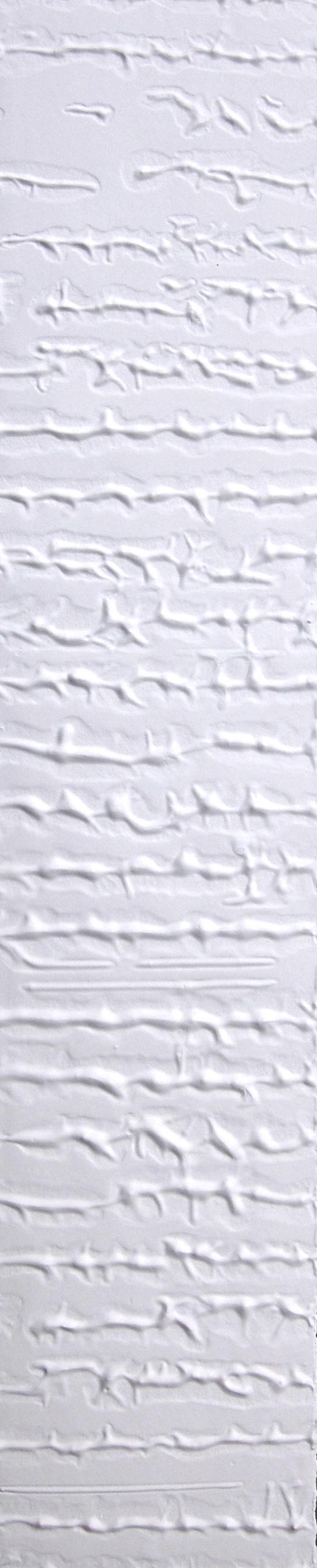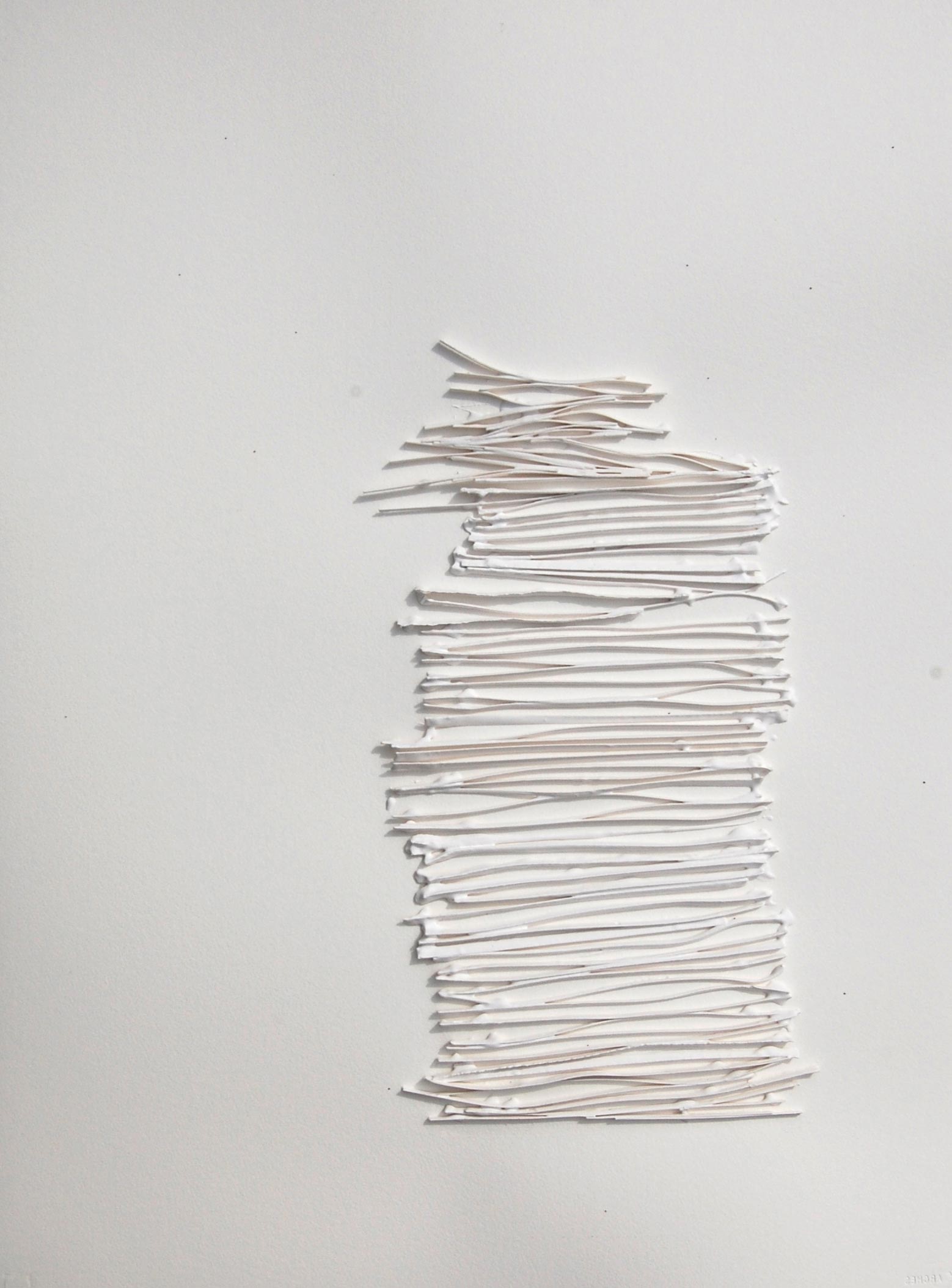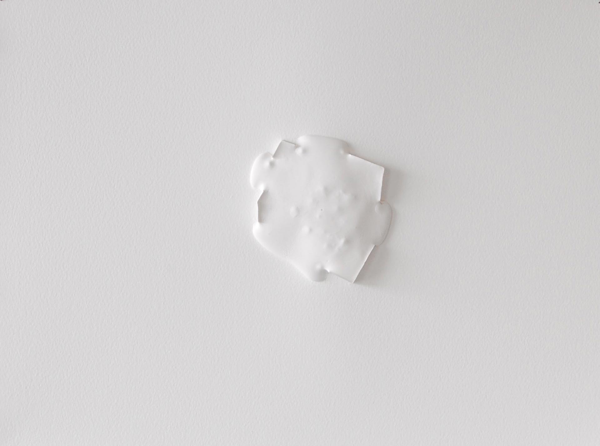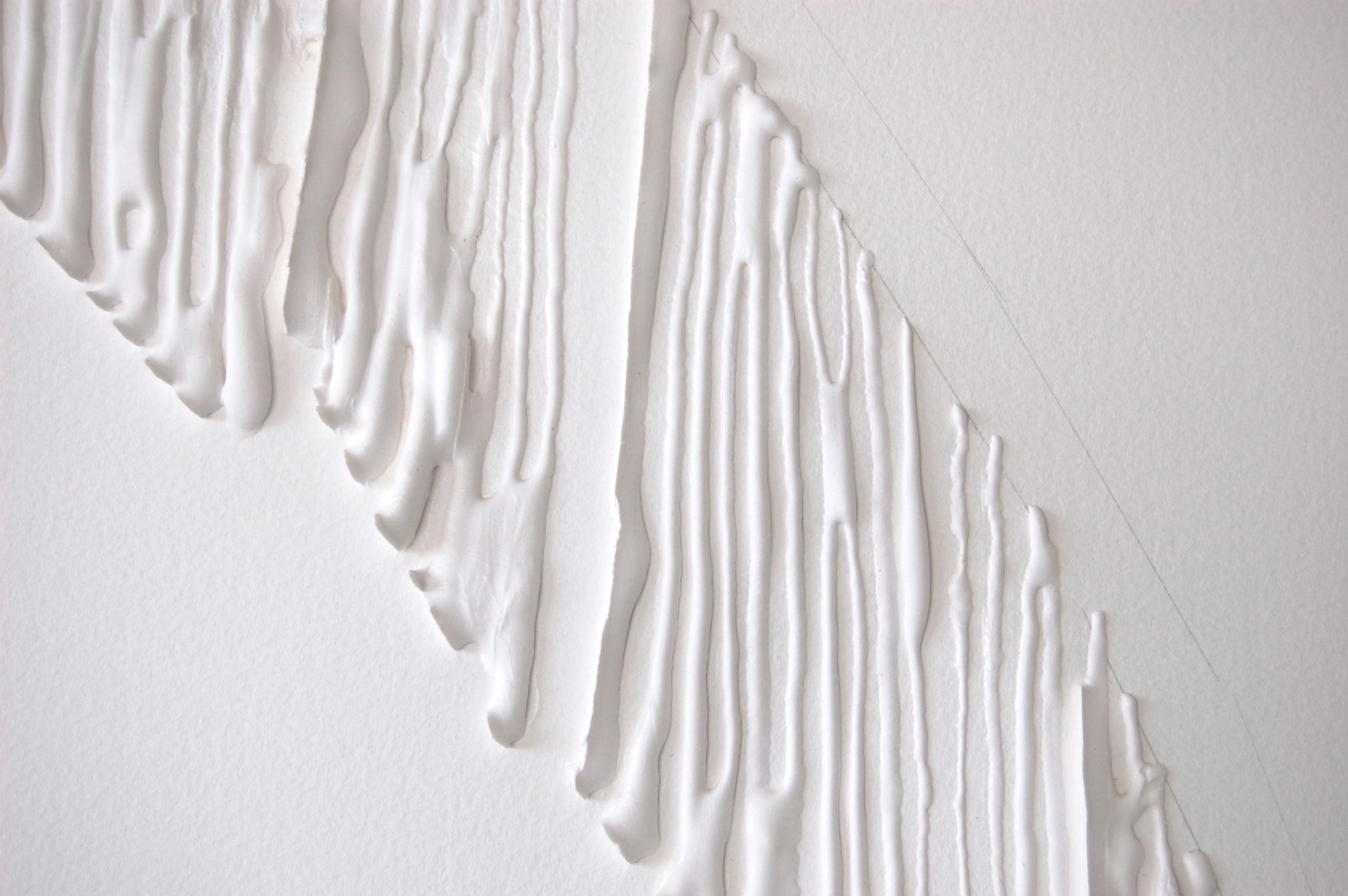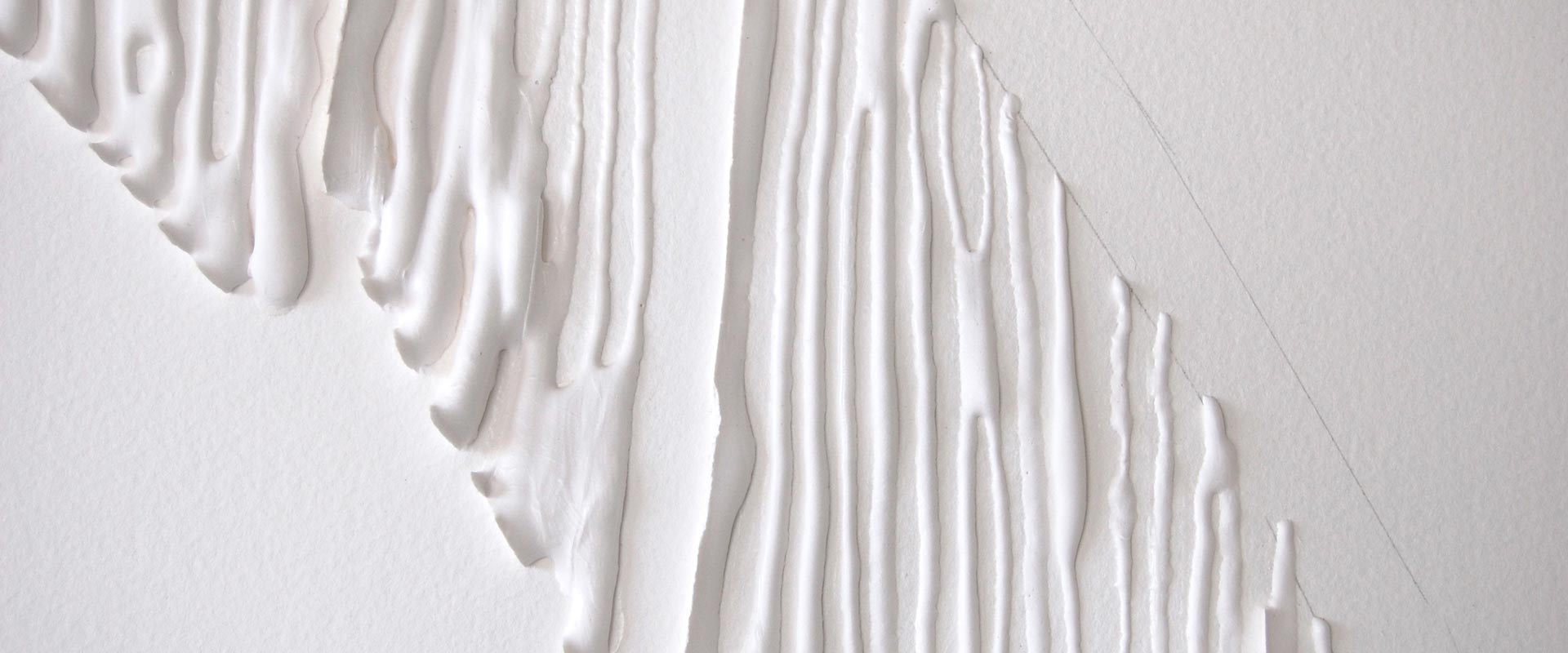 The series was started and exhibited in Paris, then shown St. Louis and New York in 2008. The body of work continues to expand as an ongoing project in my studio. The works on paper are made by pouring plaster directly onto the surface of paper while it lays flat on a table. The resulting low-relief images possess a white on white aesthetic. As the title Hybrida implies, disparate characteristics of architecture and the human body combine with one another in the works. Architectural elements, such as walls or corners, blend with qualities of flesh similar to skin and bone to create enigmatic, abstract shapes. The edges and angles of each shape establish perspectives similar to those used in architectural drawings (top-view, end-view, oblique-view). Molded contours imply forces of gravity and support that press on the forms, which in turn, sag and give way like flesh.